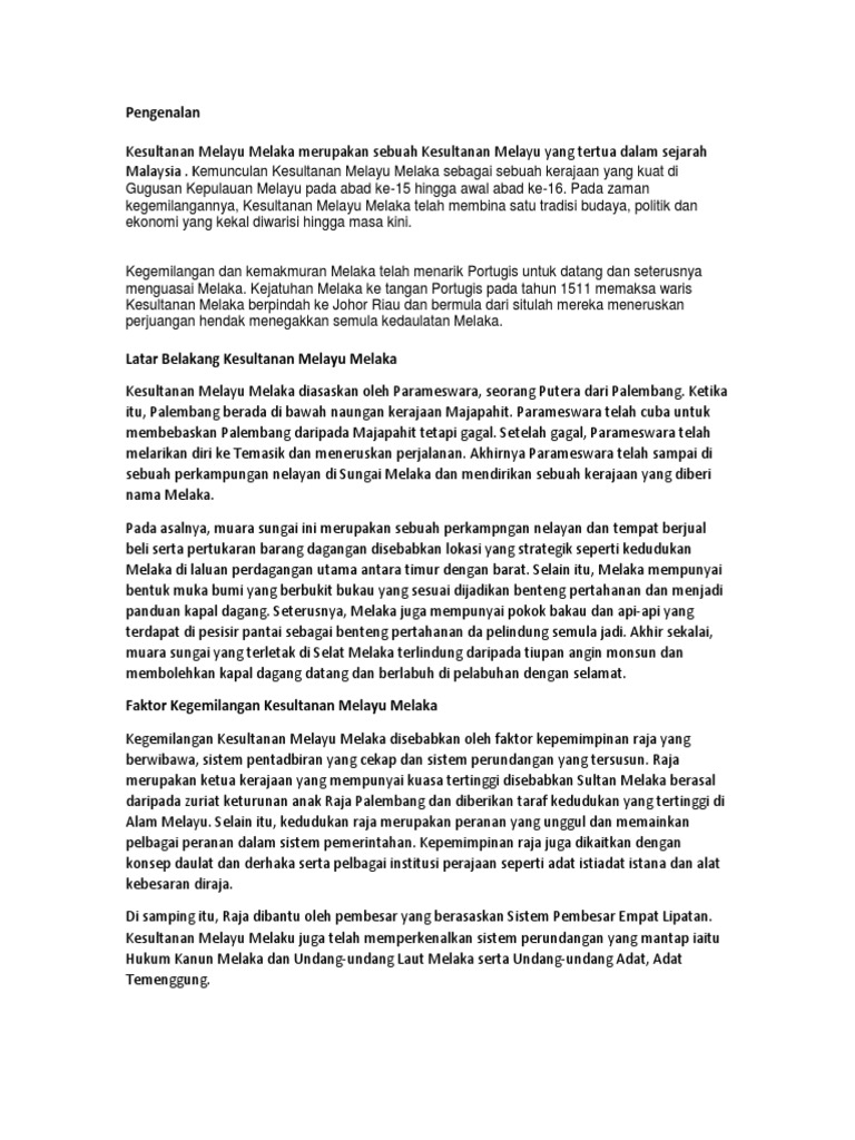 Kesinambun gan warisan kesultanan melayu melaka. Sebagai latar belakang kepada kesultanan melayu melaka, kami akan cuba menyentuh beberapa perkara berkaitan kegemilangan negeri melaka antaranya kesultanan melayu melaka merupakan warisan kerajaan srivijaya yang berpusat di palembang , sumatera tenggara. Kesultanan melayu melaka ini telah berjaya mentadbir selama lebih daripada satu abad sehingga melaka tewas kepada portugis pada tahun 1511 semasa pemerintahan sultan mahmud shah. Belakang perlawanan banten terhadap voc, latar belakang perlawanan kesultanan mataram, letak benteng bommel. Melaka diasaskan pada tahun 1400 oleh parameswara yang merupakan seorang putera raja berasal dari palembang, sumatera.