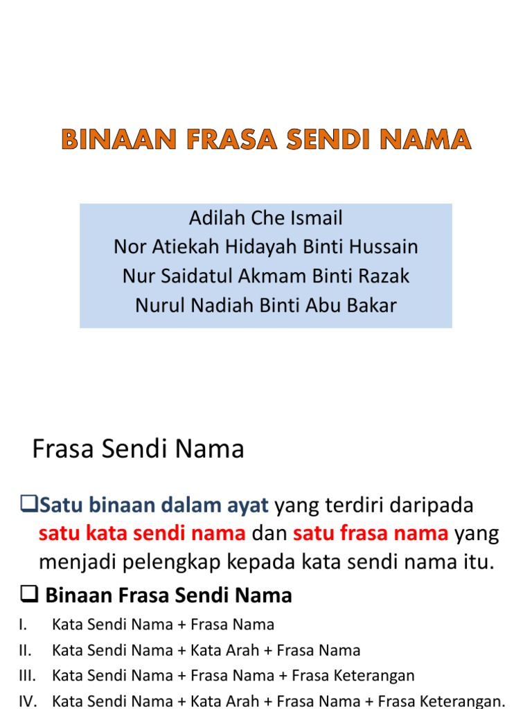 Frasa Nama Dan Frasa Adjektif Ppt Download from slideplayer.info Frasa nama hanya berfungsi sebagai predikat dalam pola fn + fn. Susunan frasa adjektif dalam ayat selepas subjek sebagai predikat selepas frasa nama sebagai penerang selepas frasa kerja sebagai keterangan 19. Contoh frasa dalam ayat : O anak kecil itu sedang tidur. Contoh kata demikian ialah berada, tinggal, menetap, bemaustatin, membelok, singgah dan sebagainya. Kedudukan frasa sendi nama dalam ayat 8. O burung merpati terbang melayang. Frasa nama terdiri daripada kata nama sebagai kepalanya.